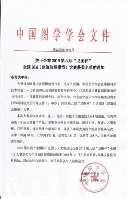 近日,公司在2019第八屆“龍圖杯”全國BIM大賽中,通過精心策劃,合理組織,憑借BIM技術(shù)的深度應(yīng)用與研發(fā)創(chuàng)新,最終獲得3項一等獎、2項二等獎、3項三等獎,共計8項獎項的好成績。