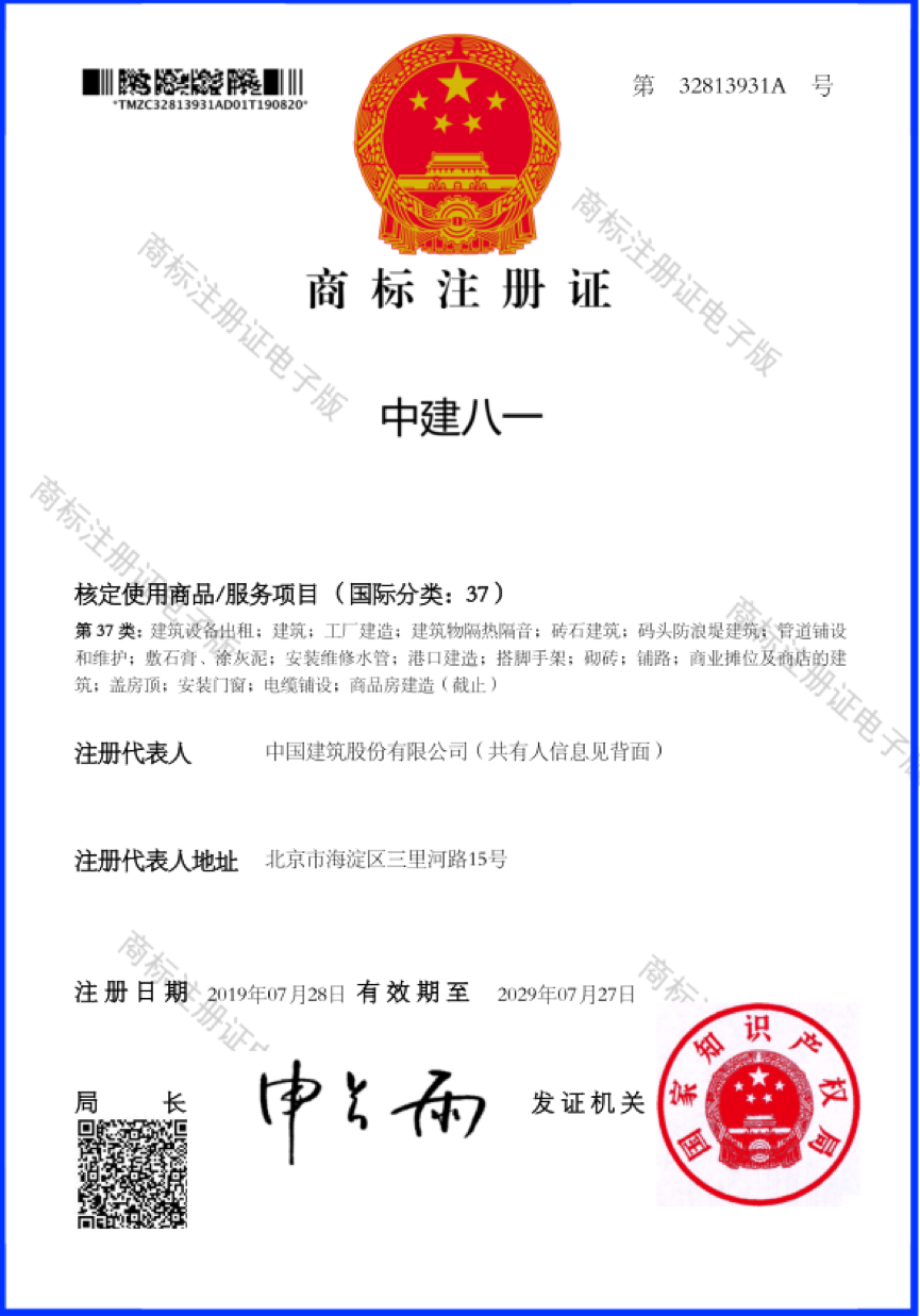 近日,由中建八局一公司申請的“中建八一”商標順利通過國家知識產(chǎn)權(quán)局的評審認定,獲得商標注冊證書,成為中建建筑品牌體系下的子商標品牌。