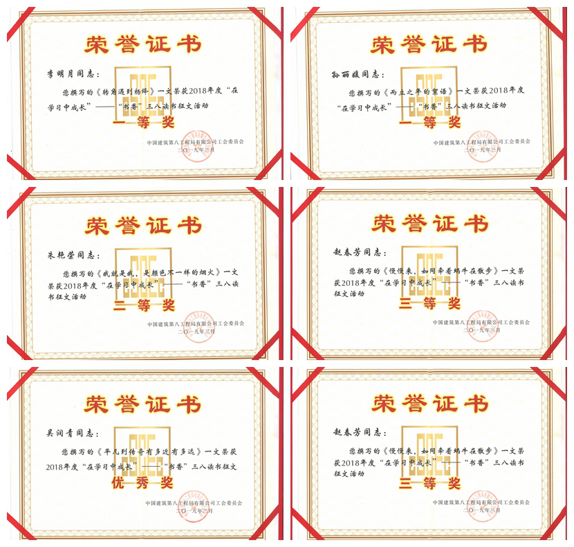在局2018年度“書香三八”讀書征文活動(dòng)中,公司機(jī)關(guān)李明月《轉(zhuǎn)角遇見楊絳----寫給〈我們仨〉》獲得讀書征文類一等獎(jiǎng),裝飾公司孫麗媛《而立之年的絮語》獲得家書類一等獎(jiǎng)。
