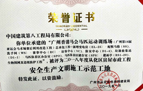 廣州香港馬會(huì)項(xiàng)目榮獲“2018年度從化區(qū)房屋市政工程安全生產(chǎn)文明施工示范工地”。