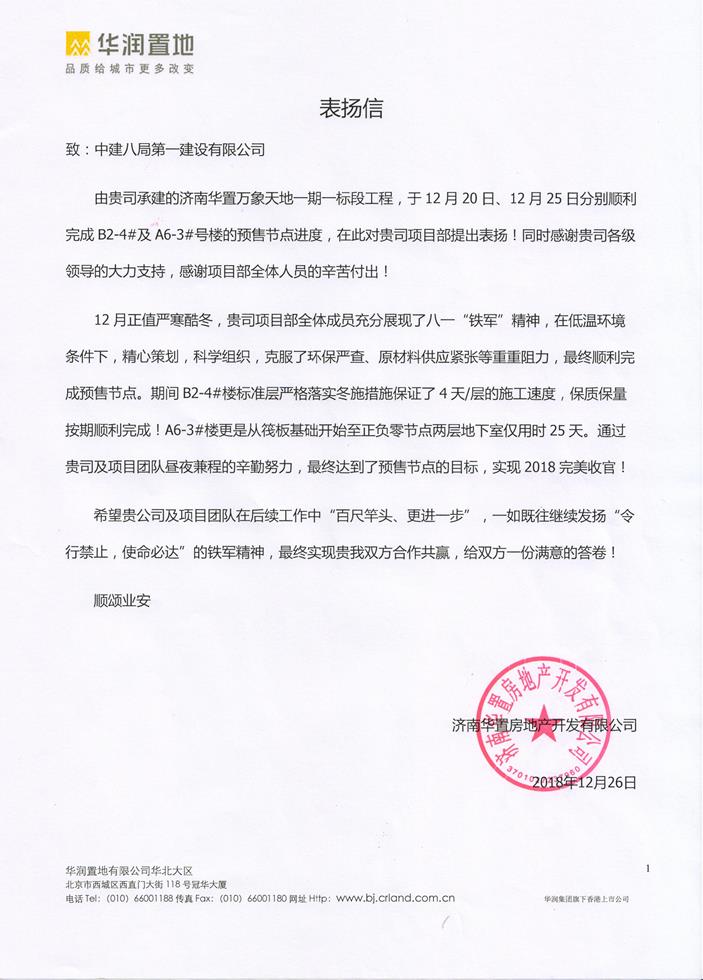 濟南華置萬象天地項目一期一標段總承包工程獲業(yè)主表揚信