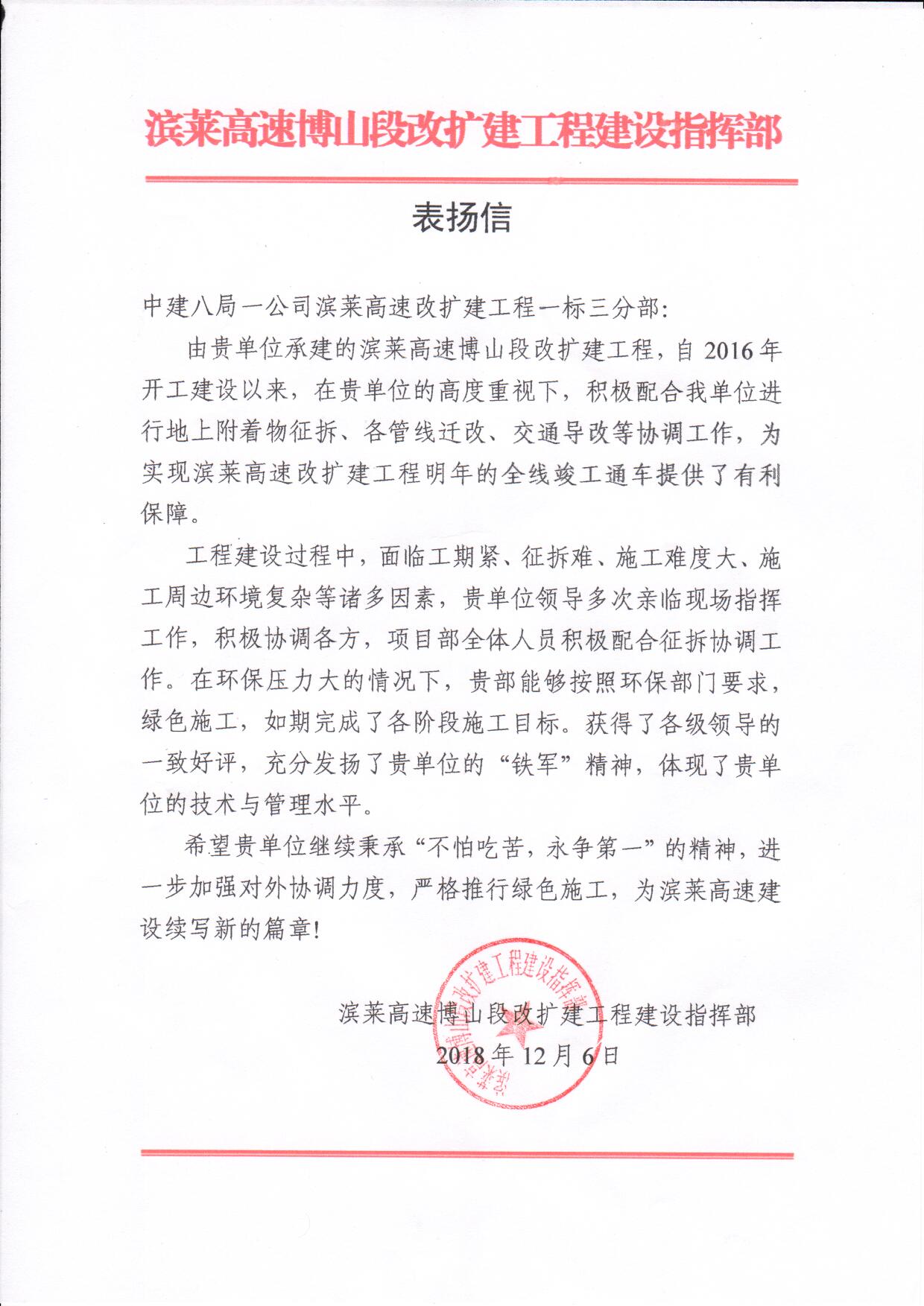 近日,濱萊高速改擴(kuò)建項(xiàng)目喜獲濱萊高速博山段改擴(kuò)建工程建設(shè)指揮部表?yè)P(yáng)信。