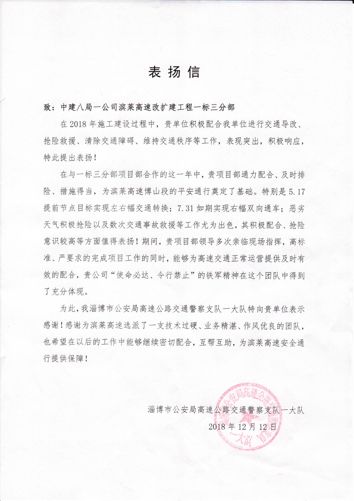 2018年12月14日,濱萊高速改擴(kuò)建項(xiàng)目喜獲淄博市公安局高速公路交通警察支隊(duì)一大隊(duì)表?yè)P(yáng)信。