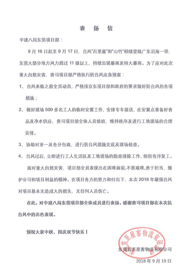近期,東莞京東項(xiàng)目接到來自業(yè)主東莞首至星客物流有限公司的表揚(yáng)信,對項(xiàng)目部全體成員應(yīng)對超強(qiáng)臺風(fēng)“山竹”的出色表現(xiàn)進(jìn)行表揚(yáng)及感謝。