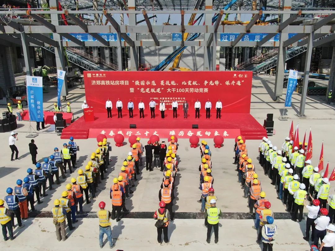 勞動競賽戰(zhàn)鼓響,項目建設(shè)勁正酣。 5月12日,濟(jì)鄭高鐵站房項目開展“強(qiáng)國示范 賽技能、比貢獻(xiàn)、爭先鋒、保開通”暨“黨建聯(lián)建”大干100天勞動競賽,廣泛開展崗位練兵、技術(shù)比武,激發(fā)技能人才創(chuàng)新創(chuàng)造活力,營造“勞動光榮、技能寶貴、創(chuàng)造偉大”的良好氛圍。