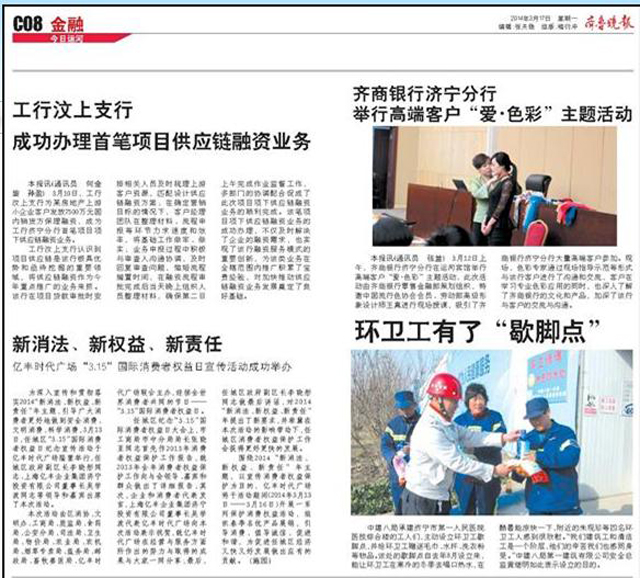 “……‘我們建筑工和清潔工是一個(gè)階層,他們的辛苦我們也感同身受?!?xiàng)目部安全總監(jiān)黃繼明如此表示設(shè)立的目的?!边@篇題為《環(huán)衛(wèi)工有了歇腳點(diǎn)》的報(bào)道刊登在了《齊魯晚報(bào)》3月17日C08版,對(duì)一公司濟(jì)寧人醫(yī)院項(xiàng)目部設(shè)立“環(huán)衛(wèi)工歇腳點(diǎn)”的做法進(jìn)行了報(bào)道。