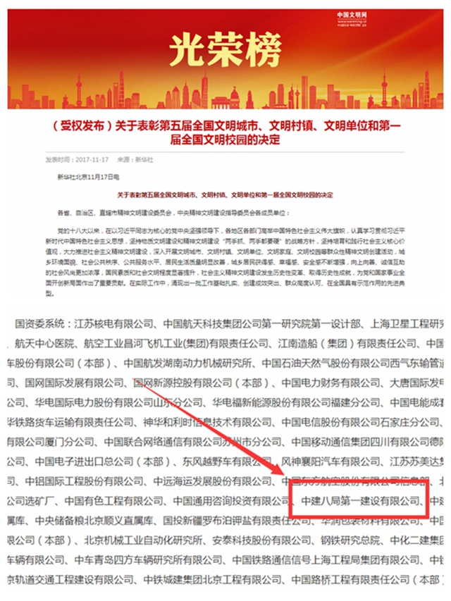 近年來(lái),公司在文明創(chuàng)建方面緊緊圍繞“黨建先行、價(jià)值引領(lǐng)、業(yè)績(jī)領(lǐng)先、責(zé)任擔(dān)當(dāng)、創(chuàng)建示范”的中心,堅(jiān)持全員、全過(guò)程、全方位創(chuàng)建,自2003年度至2016年度連續(xù)14年被評(píng)為“省級(jí)文明單位”。此次被評(píng)為全國(guó)文明單位,標(biāo)志著中建“八一”文明創(chuàng)建工作邁上了新臺(tái)階。