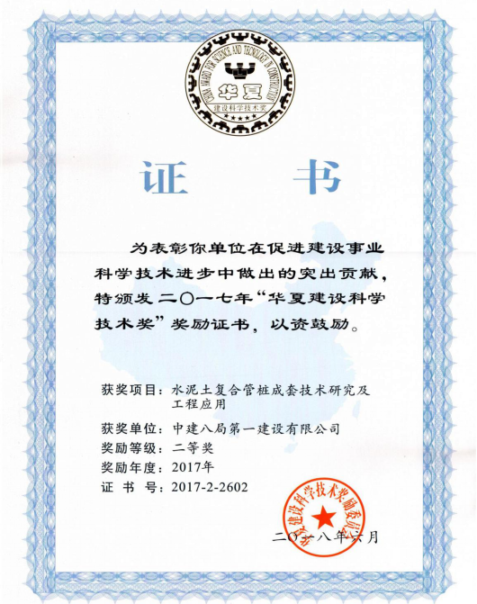 近日,全國(guó)建設(shè)科學(xué)技術(shù)領(lǐng)域的最高獎(jiǎng)項(xiàng)——華夏建設(shè)科學(xué)技術(shù)獎(jiǎng)2017年度獲獎(jiǎng)名單揭曉。公司研發(fā)的《水泥土復(fù)合管樁成套技術(shù)研究及工程應(yīng)用》榮獲二等獎(jiǎng)。