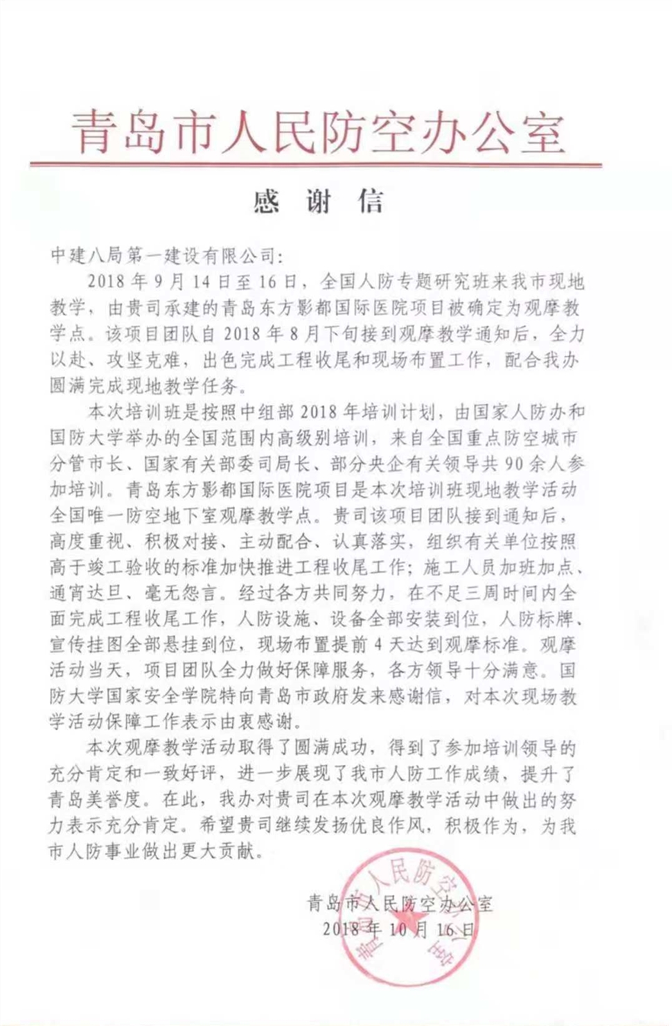 近日,青島萬達東方影都國際學校、醫(yī)院項目部收到了青島市人民防空辦公室發(fā)來的表揚信。信中著重肯定了我司在全國人防專題研究班現地教學活動中的突出貢獻,贊揚我公司能夠積極配合青島市人防辦開展工作,顯示出較強的大局意識、政治意識和較高的工作水平,同時肯定了公司的優(yōu)良作風并對后序工程項目工作的寄于厚望。