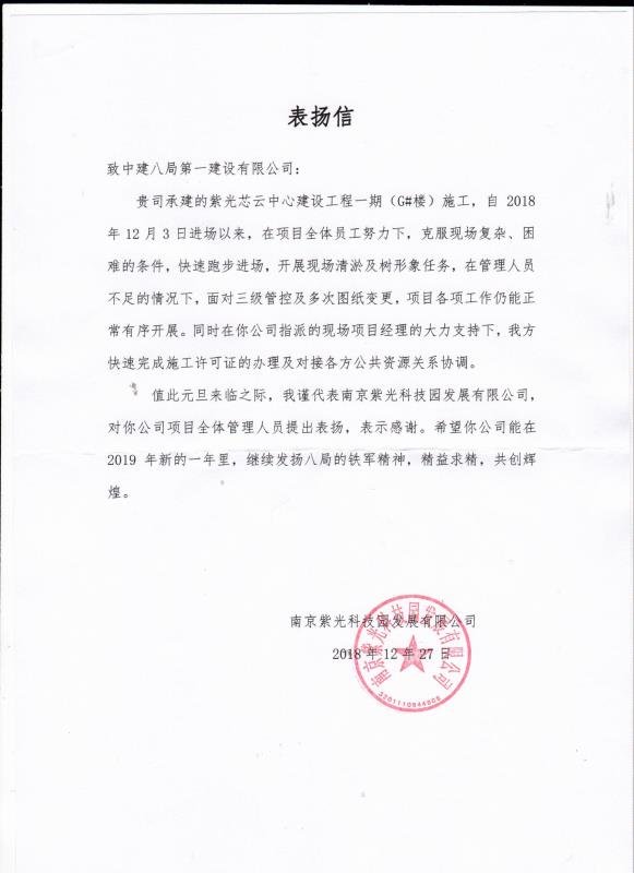 近日,南京紫光芯云中心建設工程一期G#樓項目,入場短短20天時間,喜獲業(yè)主單位表揚信。又恰逢元旦到來之際,此次表揚給予了項目全體員工極大的鼓舞和斗志。