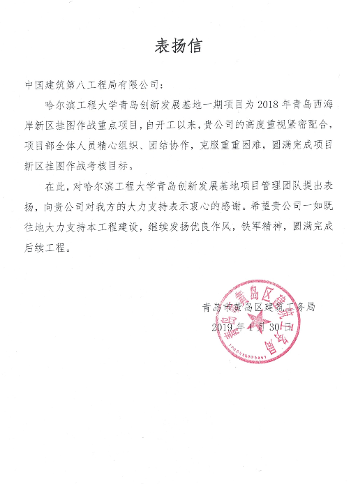 2月14日,哈爾濱工程大學(xué)青島創(chuàng)新發(fā)展基地一期項目收到來自青島市黃島區(qū)建筑工務(wù)局的表揚信。