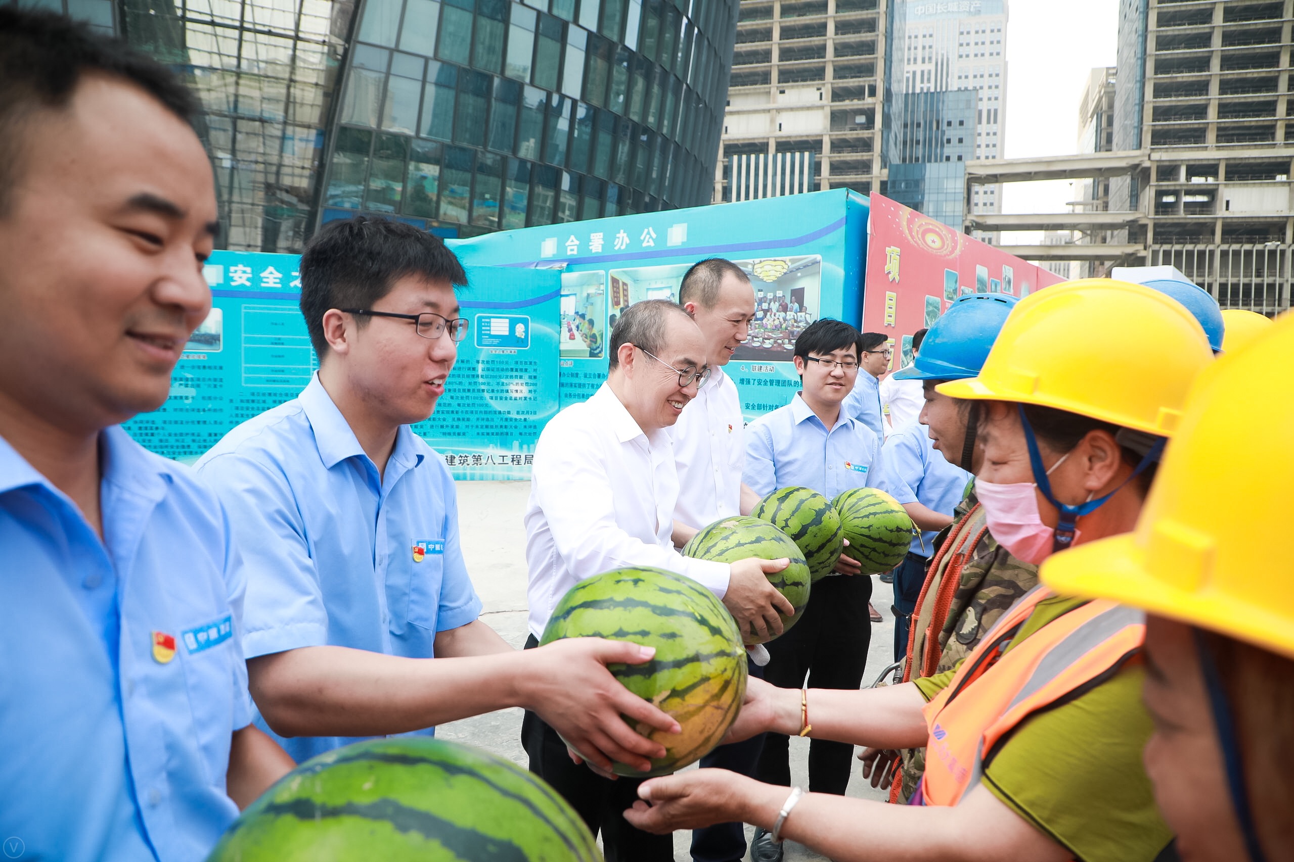 表彰大會結(jié)束后,SOHO中國各位領(lǐng)導(dǎo)與麗澤SOHO項(xiàng)目管理團(tuán)隊(duì)合影留念。同時(shí)為傳遞對一線職工的關(guān)懷與關(guān)愛,麗澤SOHO項(xiàng)目黨支部精心組織了夏日“送清涼”活動,黨支部邀請潘石屹、王濤一起為農(nóng)民工兄弟發(fā)西瓜。