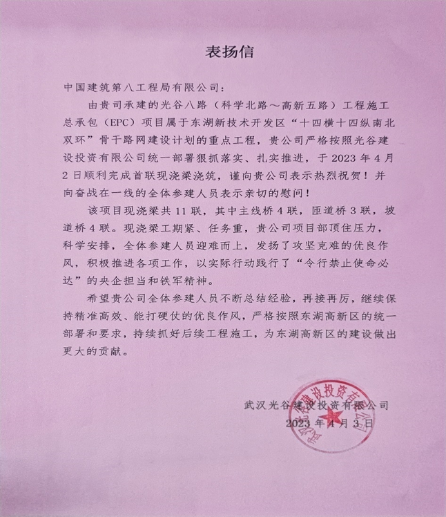 近日,武漢光谷八路項目收到業(yè)主武漢光谷建設投資有限公司表揚信一封。信中對項目順利完成首聯(lián)現(xiàn)澆澆筑表示祝賀,并向奮戰(zhàn)在一線的全體參建人員表示親切的慰問!