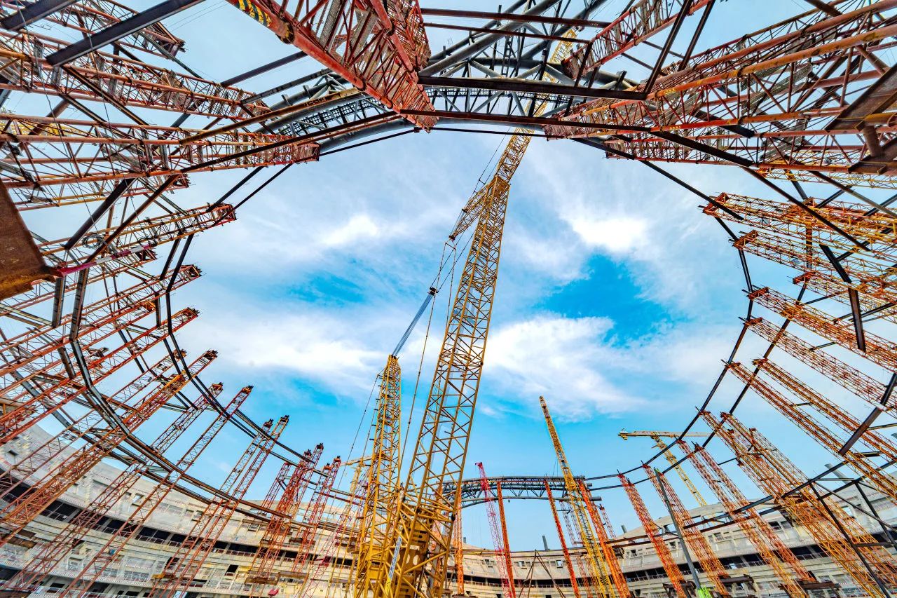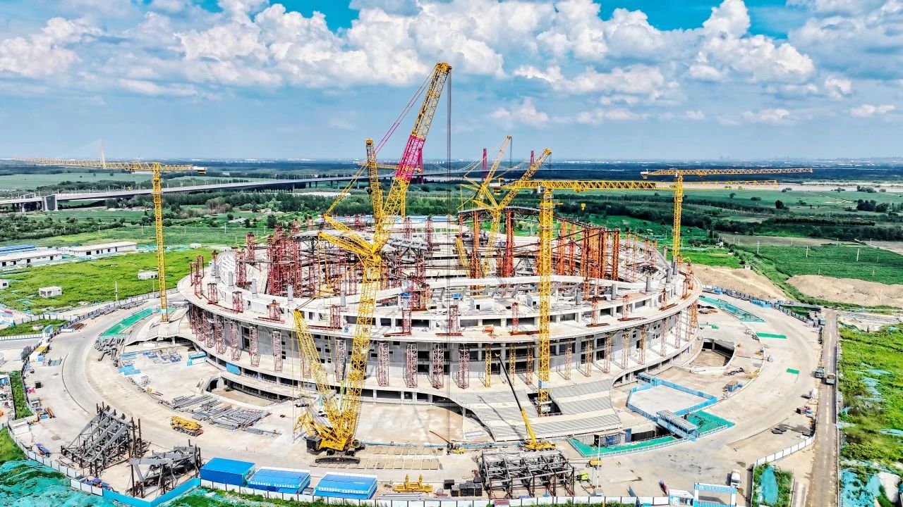 項目采用世界杯FIFA最新標準,將多種高新科技融入建造當中,是世界首個平面單層膜輪輻式索膜結構體系,國內首例專業(yè)足球場大規(guī)模應用高透光率PTFE網格膜材料,國內施工最復雜的專業(yè)足球場之一。目前項目處于屋蓋鋼結構施工階段,預計2024年完成合攏。