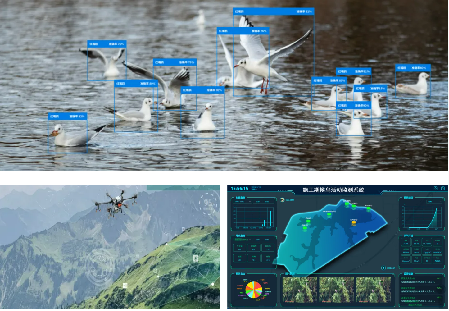 綠色環(huán)保展區(qū)針對(duì)沉湖濕地生態(tài)保護(hù)需求,建立鳥類遷徙、魚類產(chǎn)卵期動(dòng)態(tài)監(jiān)測(cè)機(jī)制,研發(fā)基于人工智能的候鳥活動(dòng)監(jiān)測(cè)系統(tǒng),利用高清攝像頭、聲音傳感器和 AI 算法,檢測(cè)鳥類聚集或敏感行為,通過水質(zhì)監(jiān)測(cè)設(shè)備采集水溫等關(guān)鍵信息,并針對(duì)性調(diào)整施工計(jì)劃,確保工程建設(shè)與自然環(huán)境和諧共存。