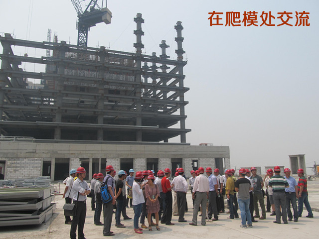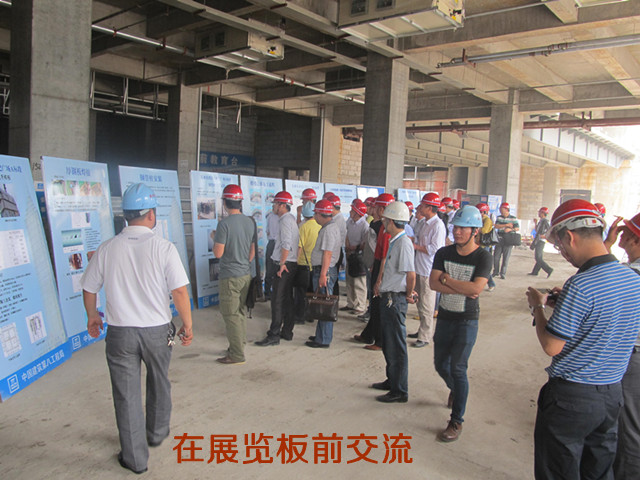 袁董事長(zhǎng)一行在相關(guān)人員帶領(lǐng)下,深入施工現(xiàn)場(chǎng)觀摩指導(dǎo)。過(guò)程中大家就大體積混凝土澆筑、超大噸位動(dòng)臂式內(nèi)爬塔吊爬升及其大跨度鋼梁、超高層混凝土超高壓泵送、鋼管柱高拋?zhàn)悦軐?shí)混凝土、集成式電動(dòng)爬升模板、高速施工電梯等施工技術(shù)進(jìn)行了深入的交流。大家對(duì)施工現(xiàn)場(chǎng)的標(biāo)準(zhǔn)化防護(hù)設(shè)施、安全文明施工給予了高度評(píng)價(jià)。