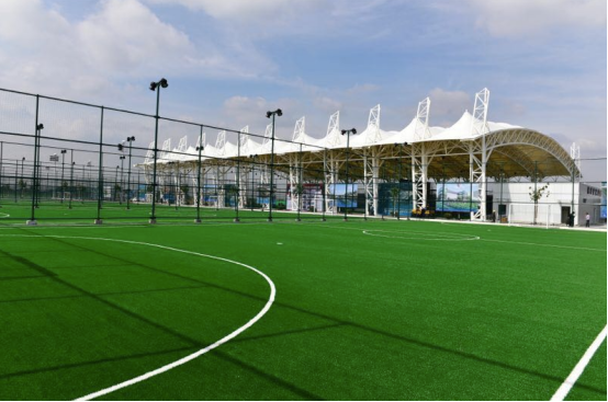 觀摩展示區(qū)位于一塊7人制的風(fēng)雨球場中,球場采用了膜結(jié)構(gòu),潔白的“外殼”將綠色的足球世界擁抱其中,交相輝映。觀摩團(tuán)在這個(gè)球場里觀看了濱州國際足球運(yùn)動(dòng)小鎮(zhèn)的宣傳視頻,并欣賞了足球運(yùn)動(dòng)健兒的花式足球表演。