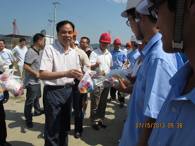 馬書記一行給大家?guī)砹朔朗罱禍赜闷?,并慰問了?xiàng)目及勞務(wù)人員,聽取了項(xiàng)目經(jīng)理畢軍偉關(guān)于工程總體情況以及工程進(jìn)度的匯報(bào),視察了施工現(xiàn)場,馬以書記對(duì)高溫期間八局所體現(xiàn)的鐵軍精神表示肯定和贊揚(yáng),并囑咐項(xiàng)目人員做好防暑降溫工作。(孫筠)