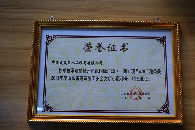 德州星凱國際廣場項目榮獲“山東省建筑施工安全文明小區(qū)”稱號