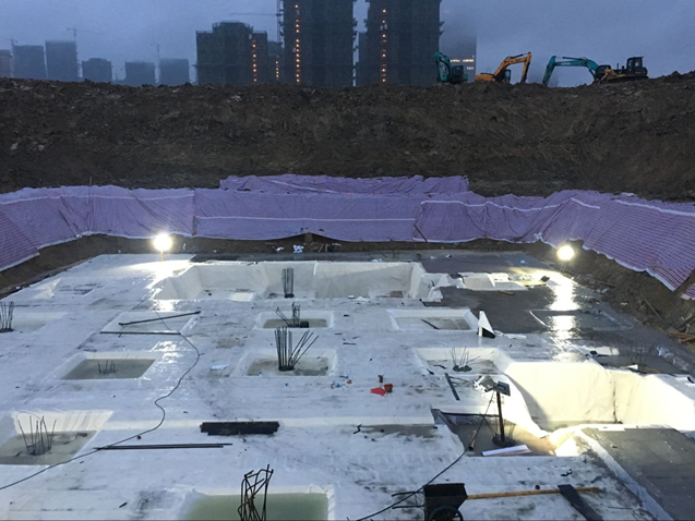 施工期間,合肥出現(xiàn)了二十幾天的連續(xù)陰雨天氣,基坑支護(hù)未施工,出現(xiàn)了多處土方坍塌,新澆墊層被埋。面對種種困難,項(xiàng)目部迎難而上,調(diào)集了九臺大挖,24h連續(xù)作業(yè),保證了基坑的安全。