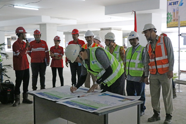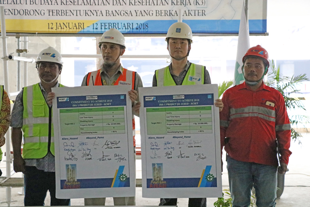 早上七時三十分,活動正式開始,主持人致辭并宣讀了本年度安全生產月活動主題及啟動儀式的主要流程。活動儀式上,總監(jiān)理工程師Dedi宣讀了印尼勞工部關于建筑行業(yè)安全生產的相關法律和法規(guī),安全部經理Iswanto就2017年項目安全生產活動進行總結報告,詳細回顧了過去一年里項目在安全管理方面取得的一系列成績,并就2018年安全管理目標進行了展望?;顒舆€對項目2018年度安全生產活動進行了詳細部署,項目經理劉嘉東等主要管理人員簽訂了目標責任狀。