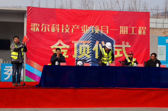 1月30日,青島公司歌爾科技產(chǎn)業(yè)項(xiàng)目一期工程舉行隆重的主體封頂儀式。儀式由歌爾科技有限公司項(xiàng)目副總濮陽(yáng)主持,公司相關(guān)人員參加了封頂儀式。上午11時(shí)18分,隨著最后一斗混凝土的澆筑完成,歌爾集團(tuán)副總裁姜傳朋代表業(yè)主宣布:歌爾科技產(chǎn)業(yè)項(xiàng)目一期工程順利封頂。