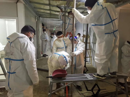3月18日,在接到吉林市高新南區(qū)隔離方艙建設(shè)任務(wù)后,公司副總經(jīng)理寧文忠擔(dān)任總指揮,華北、安裝、裝飾公司迅速部署,僅用5個小時完成人員調(diào)配、核酸檢測和后備物資的集結(jié)。首發(fā)隊(duì)伍于當(dāng)晚六點(diǎn)出發(fā),星夜兼程、跨越千里奔赴吉林。