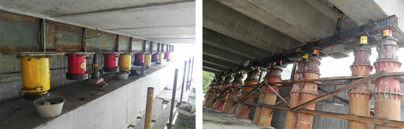 項(xiàng)目團(tuán)隊(duì)采用橋梁整體同步調(diào)坡頂升技術(shù),每個(gè)液壓千斤頂配備一個(gè)位移傳感器,實(shí)時(shí)監(jiān)測(cè)、控制橋梁頂升的位移和姿態(tài),使同步頂升的精度精確到1毫米,萬(wàn)噸重的橋梁“拔地而起”。