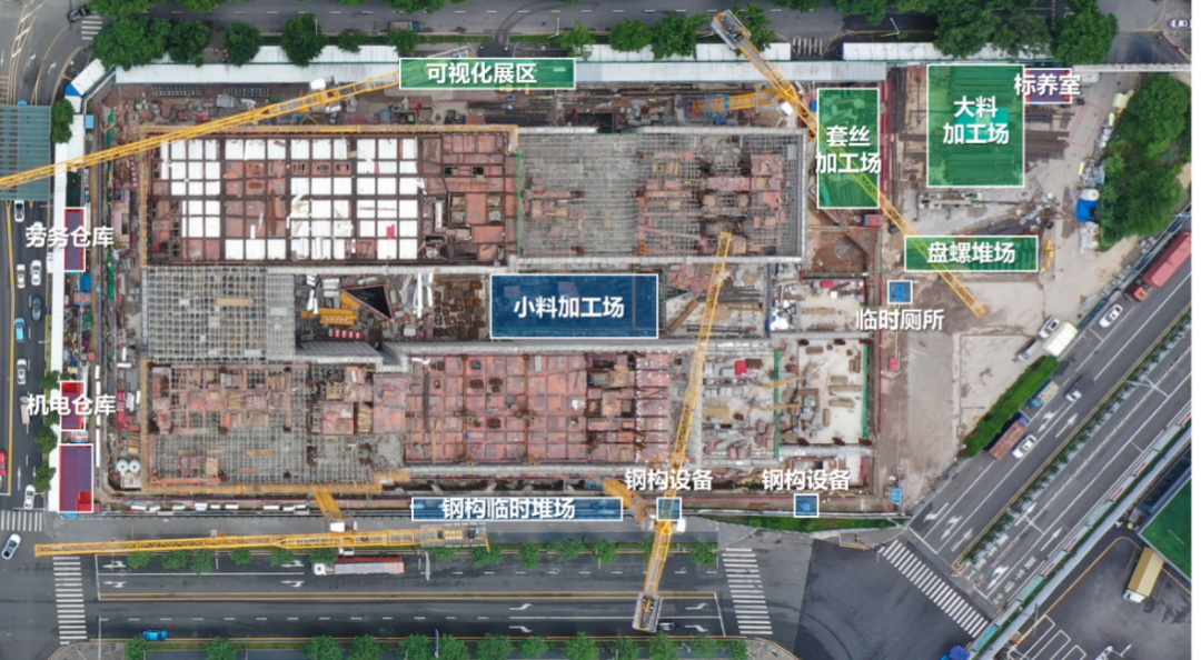 面對(duì)場(chǎng)地狹小的問題,項(xiàng)目靈活安排施工部署,優(yōu)先打通環(huán)場(chǎng)道路,及時(shí)轉(zhuǎn)移料場(chǎng),騰出樁基施工作業(yè)面,利用裙樓屋面作為外架、幕墻材料堆場(chǎng)實(shí)現(xiàn)“7天一層”的主體結(jié)構(gòu)工期。