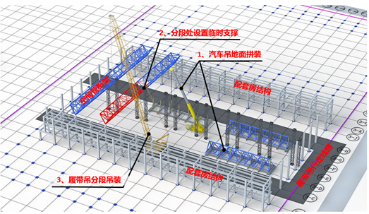 項目靠近飛機起落航道,施工作業(yè)限高,單榀桁架重達160噸,跨度130余米,無法采用常規(guī)高處作業(yè)吊裝方法,項目團隊選取300噸履帶吊車,將一榀桁架分兩段組裝安裝,半榀桁架下部采用支撐系統(tǒng)支撐,待一榀桁架全部安裝焊接完成后,拆除支撐體系,順利完成桁架結(jié)構(gòu)吊裝。