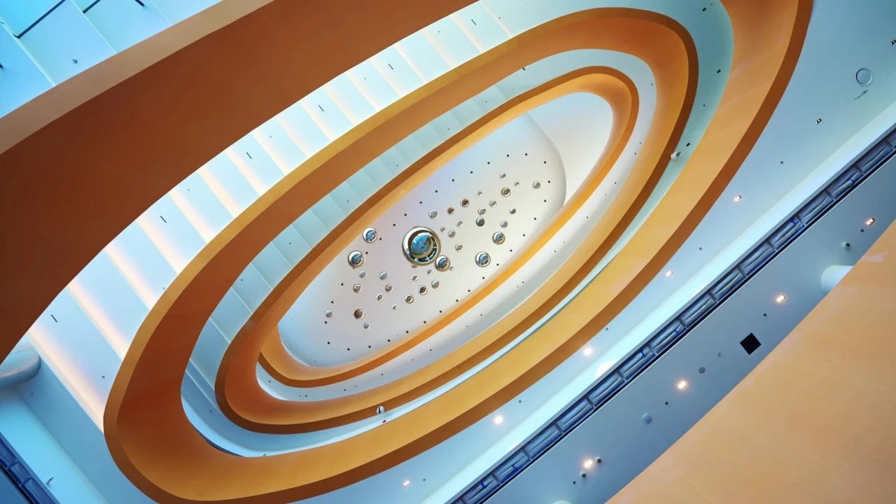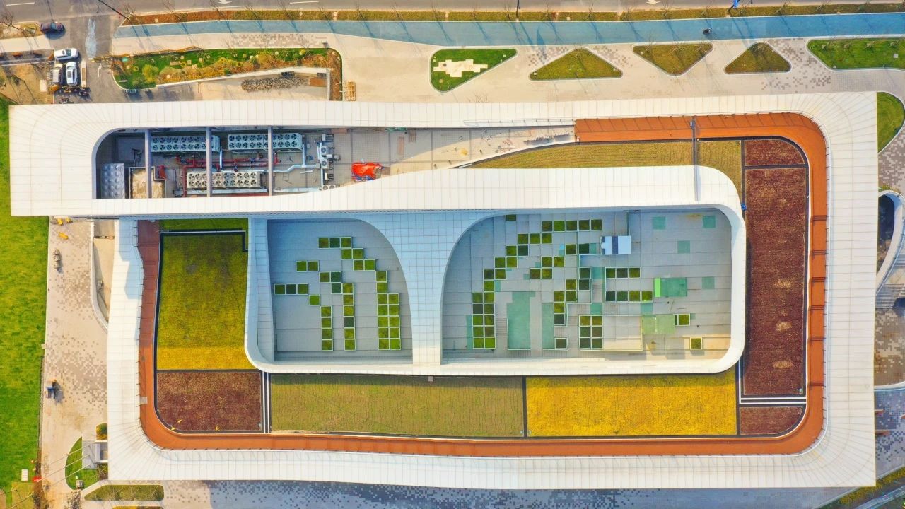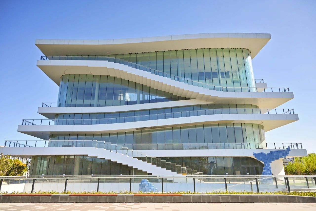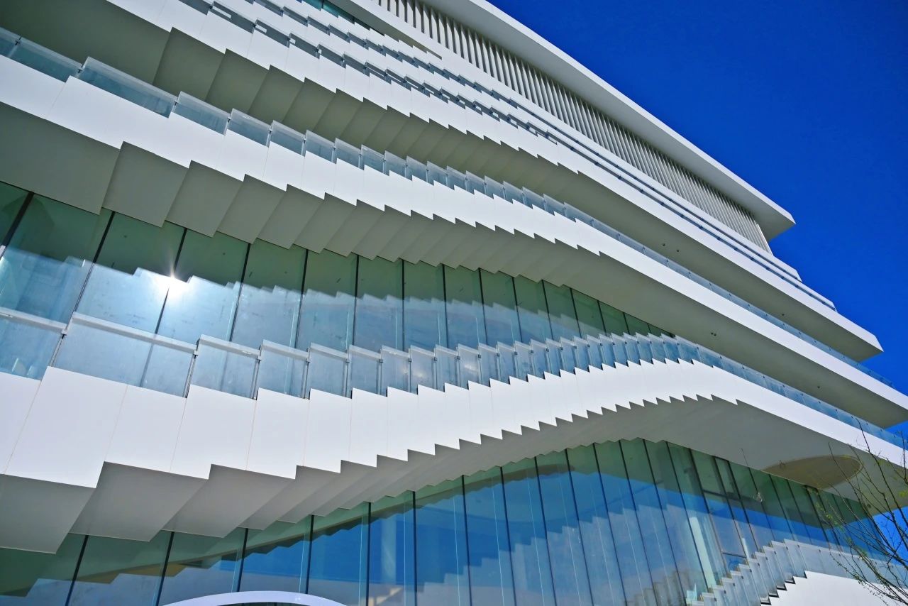 在建筑外圍設(shè)計(jì)上,為了契合青少年群體熱情、活潑的特征,項(xiàng)目聚焦?fàn)I造輕盈通透、層次豐富的視覺(jué)感受,以環(huán)繞疊加的樓梯修飾外立面,采用阿魯克邦?高光瓷白鋁復(fù)合板勾勒樓梯線(xiàn)條,弱化空間邊界,同時(shí)大面積采用玻璃幕墻擴(kuò)展視野,與城市環(huán)境相呼應(yīng),使室內(nèi)空間更加開(kāi)放和友好。