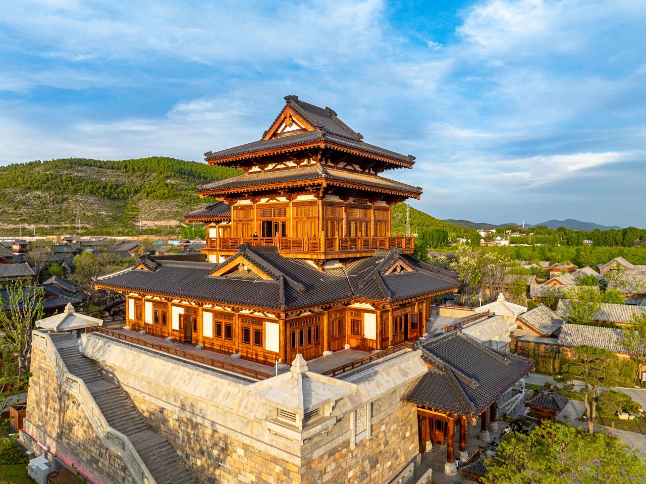 項目制高點文昌閣應用古代圓形攢尖屋頂設計,屋面108壟瓦對應星辰,12道脊代表十二時辰,登頂可俯瞰尼山全景。