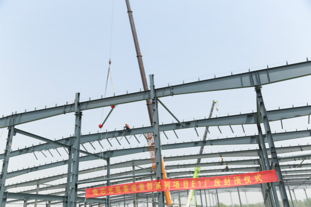 4月18日,奇芯光電項目E1廠房舉行了鋼結(jié)構(gòu)封頂儀式。