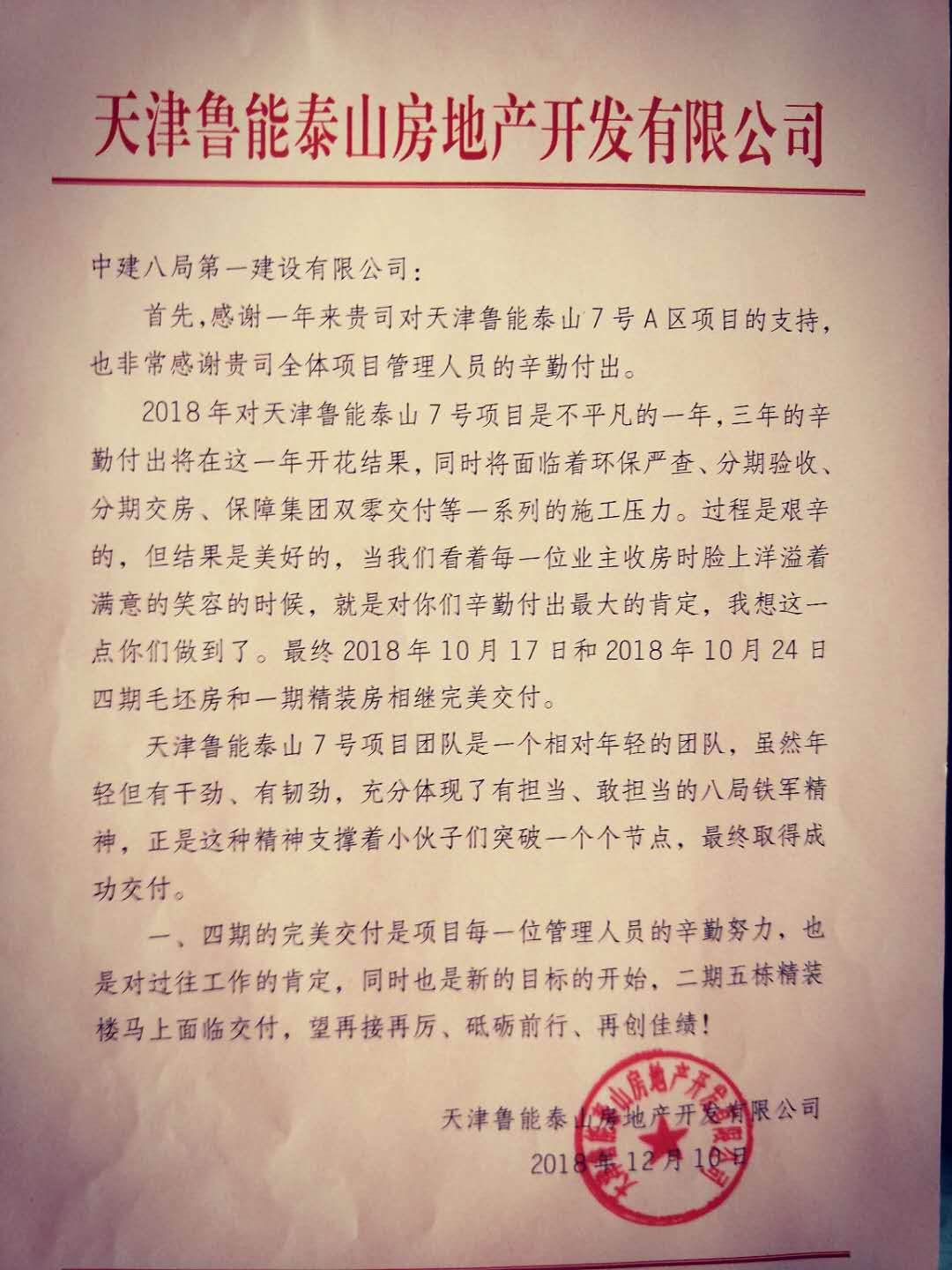 天津魯能泰山7號A區(qū)項目喜獲業(yè)主表揚(yáng)信