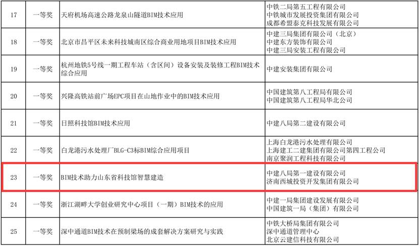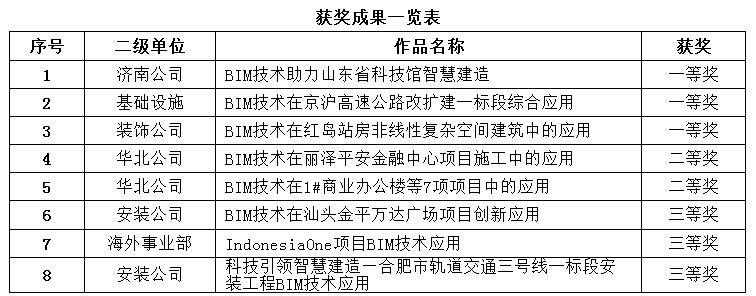 我公司在本屆比賽中通過(guò)精心策劃,合理組織,憑借BIM技術(shù)的深度應(yīng)用與研發(fā)創(chuàng)新,最終獲得一等獎(jiǎng)3項(xiàng),二等獎(jiǎng)2項(xiàng),三等獎(jiǎng)3項(xiàng)的歷史最佳成績(jī),業(yè)內(nèi)領(lǐng)先地位愈發(fā)突顯。