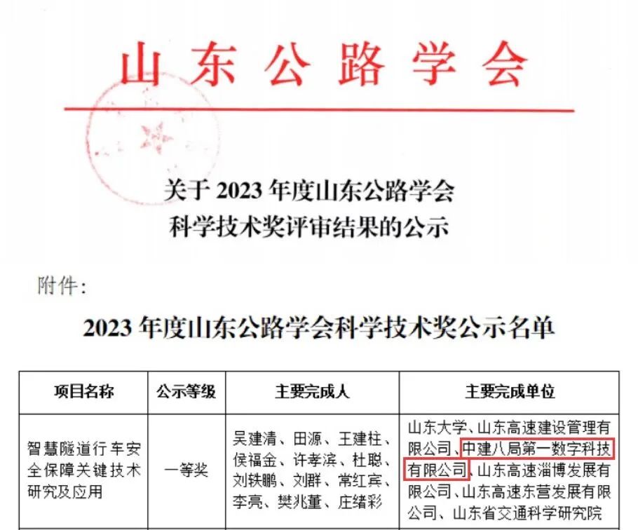 近日,2023年度山東公路學(xué)會(huì)科學(xué)技術(shù)獎(jiǎng)完成評(píng)審結(jié)果公示,中建八局第一數(shù)字科技有限公司參與的”智慧隧道行車安全保障關(guān)鍵技術(shù)研究與應(yīng)用”科技創(chuàng)新項(xiàng)目獲評(píng)山東公路學(xué)會(huì)科學(xué)技術(shù)獎(jiǎng)一等獎(jiǎng)。