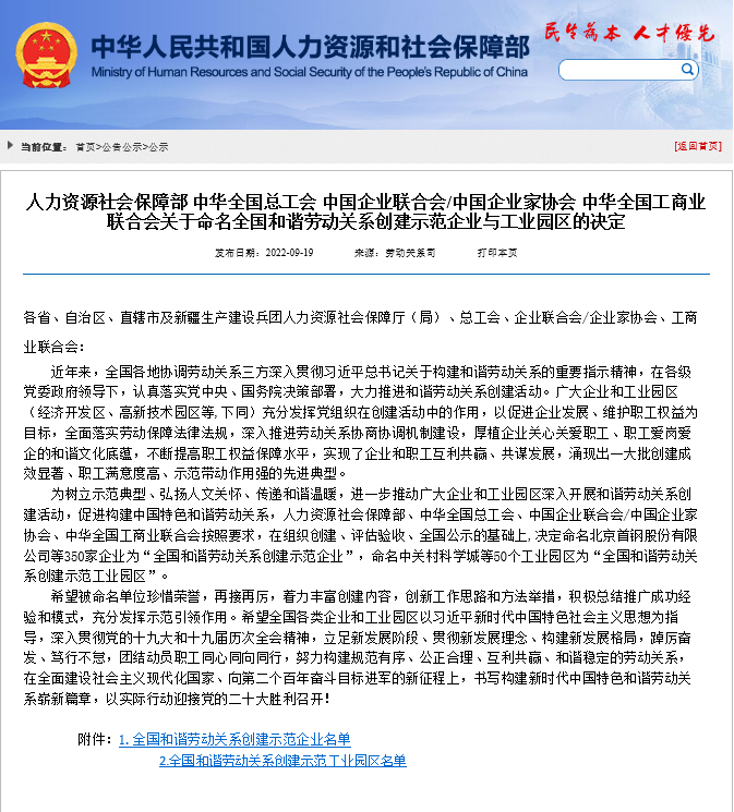 近日,人力資源和社會保障部、中華全國總工會、中國企業(yè)聯(lián)合會/中國企業(yè)家協(xié)會、中華全國工商業(yè)聯(lián)合會聯(lián)合印發(fā)關于命名全國和諧勞動關系創(chuàng)建示范企業(yè)與工業(yè)園區(qū)的決定。本次共評選出350家創(chuàng)建成效顯著、職工滿意度高、示范帶動作用強的先進典型,中建八局一公司作為山東省17家企業(yè)之一、濟南市唯一一家企業(yè),入選全國和諧勞動關系創(chuàng)建示范企業(yè)。