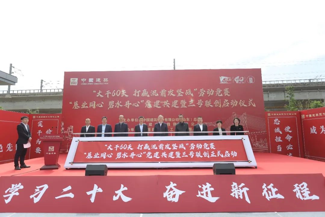 活動現(xiàn)場,濟(jì)南市城鄉(xiāng)水務(wù)局、濟(jì)南市排水服務(wù)中心、濟(jì)南市市中區(qū)水務(wù)局、中建山東投資有限公司、中建(濟(jì)南)投資建設(shè)有限公司、中建八局濟(jì)南雨污分流項(xiàng)目各黨支部開展黨建共建活動,并進(jìn)行黨建共建揭牌。參會領(lǐng)導(dǎo)為“黨員先鋒號、工人先鋒號、青年文明號”“道路突擊隊(duì)、河道突擊隊(duì)、建筑小區(qū)突擊隊(duì)”授旗。