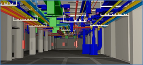項(xiàng)目地下階段施工時(shí)考慮到機(jī)電預(yù)留預(yù)埋、地鐵聯(lián)絡(luò)線接駁等需要深化的部位,利用BIM模型對(duì)復(fù)雜節(jié)點(diǎn)進(jìn)行放樣和深化,可以指導(dǎo)現(xiàn)場(chǎng)施工。項(xiàng)目在機(jī)電深化過程中,利用BIM軟件進(jìn)行管線綜合布置和碰撞檢查,并生成碰撞報(bào)告,出具圖紙向業(yè)主設(shè)計(jì)部報(bào)審。