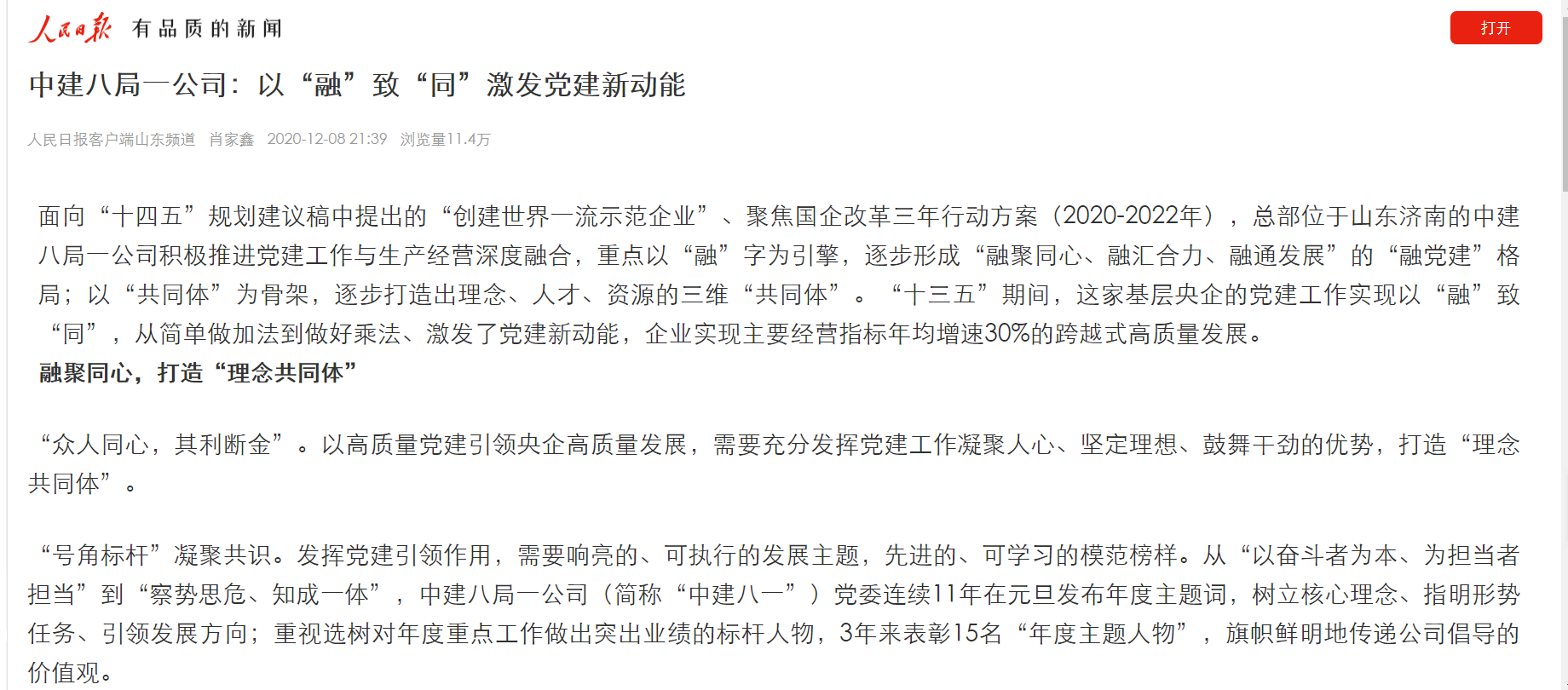 12月8日,《人民日報》客戶端以《中建八局一公司:以“融”致“同”激發(fā)黨建新動能》為題,全文刊發(fā)公司“融黨建”工作的經(jīng)驗做法,瀏覽量很快突破10萬+。