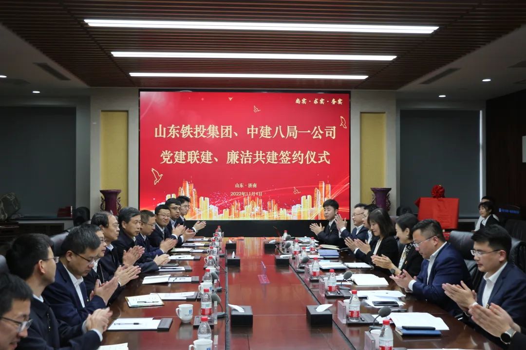 11月4日,中建八局一公司與山東鐵投集團舉行黨建聯(lián)建、廉潔共建簽約儀式。 山東鐵投集團工會主席、職工董事、機關(guān)黨委專職副書記張慶星,濟青高鐵公司黨委副書記、工會主席、監(jiān)事會主席張富兵,山東鐵投集團計劃管理部黨支部書記、部長張銘及濟青高鐵公司相關(guān)部門負責人,中建八局一公司黨委副書記、工會主席聶麗及黨委工作部、工會工作部、基礎設施公司相關(guān)負責人參加活動。